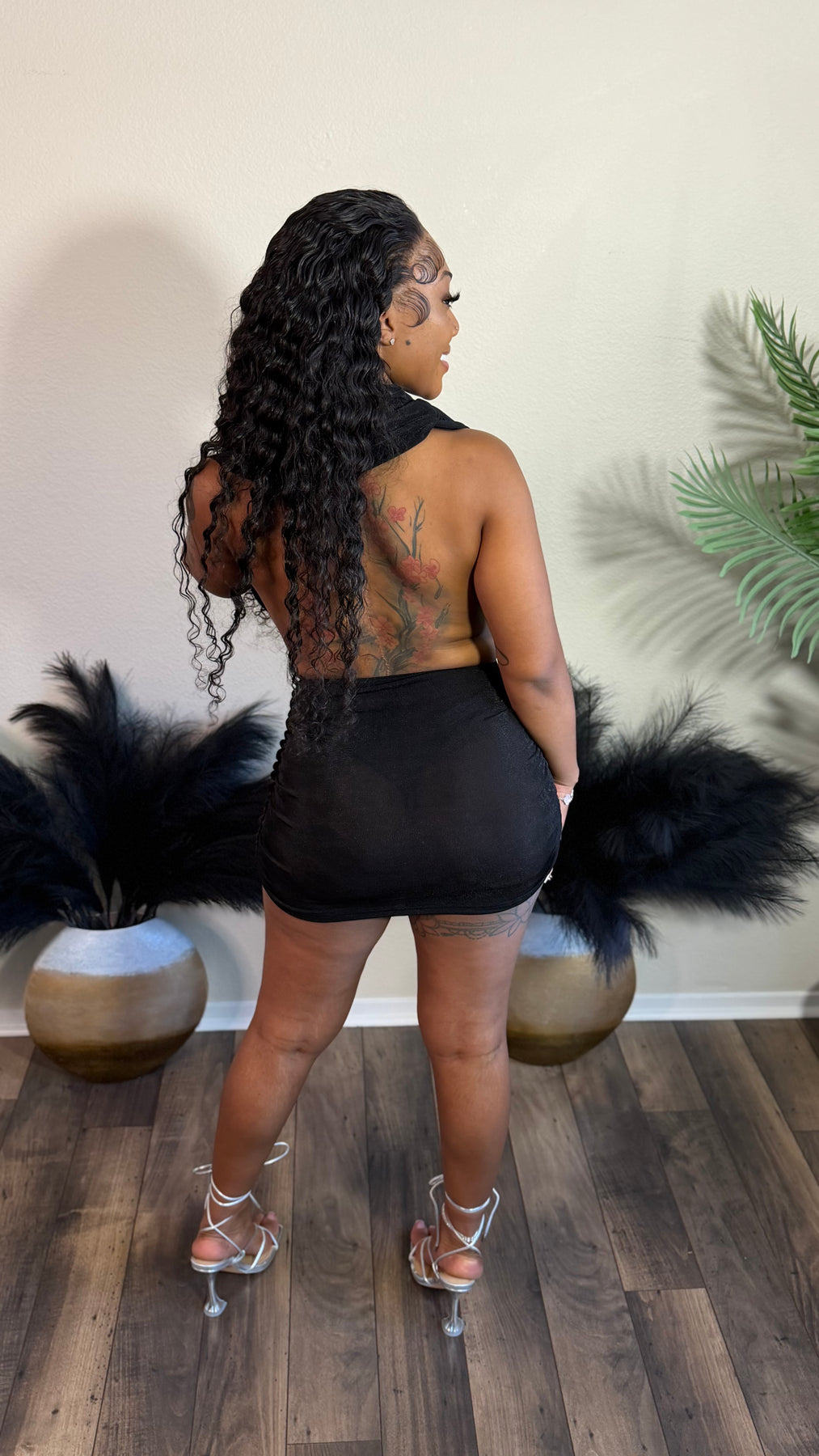 95% polyester 5% spandex. Halter dress. Sheer material. Thick quality. Stretchy material.